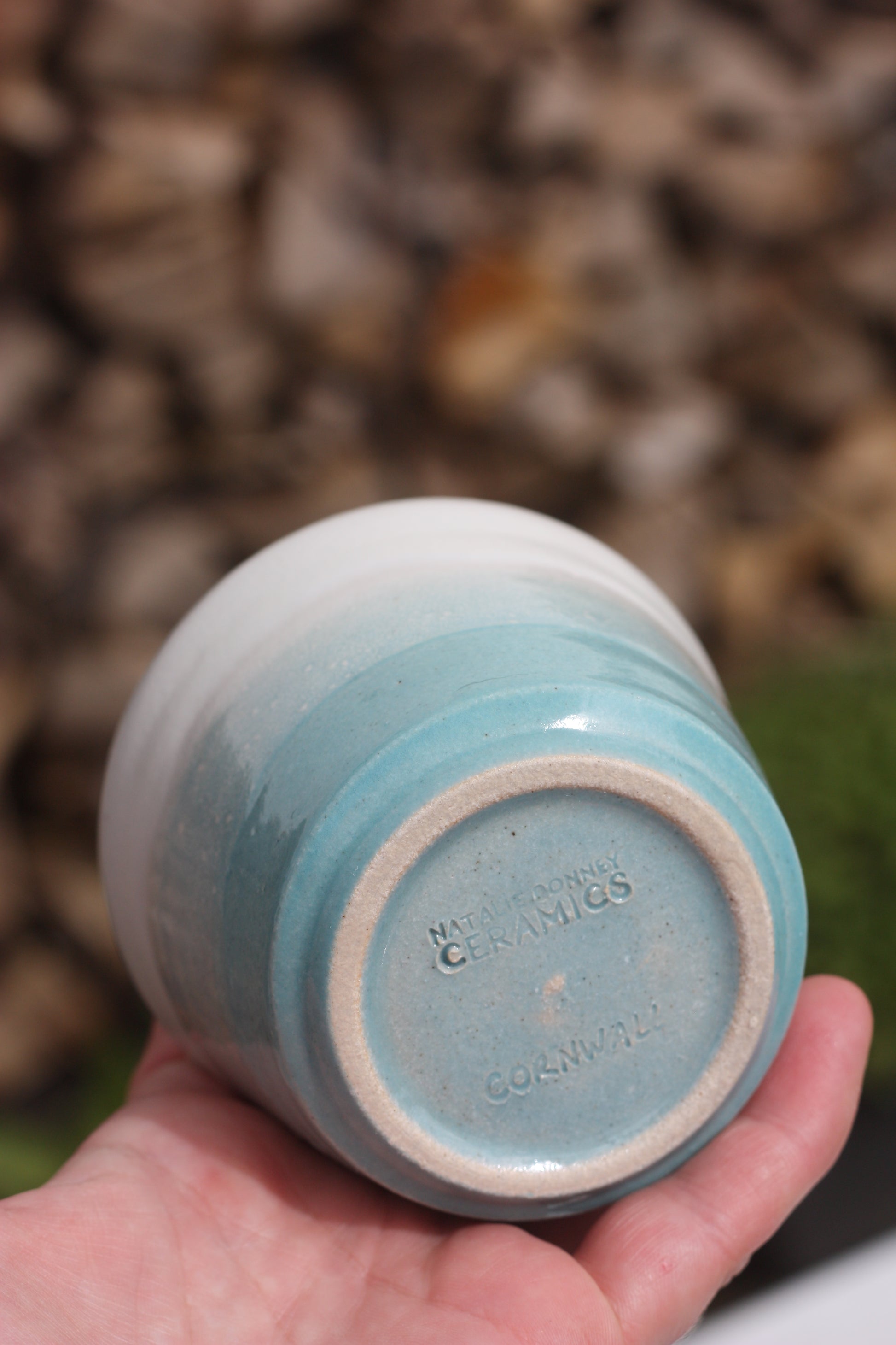 It's been fired to 1240 degrees centigrade and is glazed with a tactile handmade smooth eggshell feel celadon glaze dipped in two different colours.