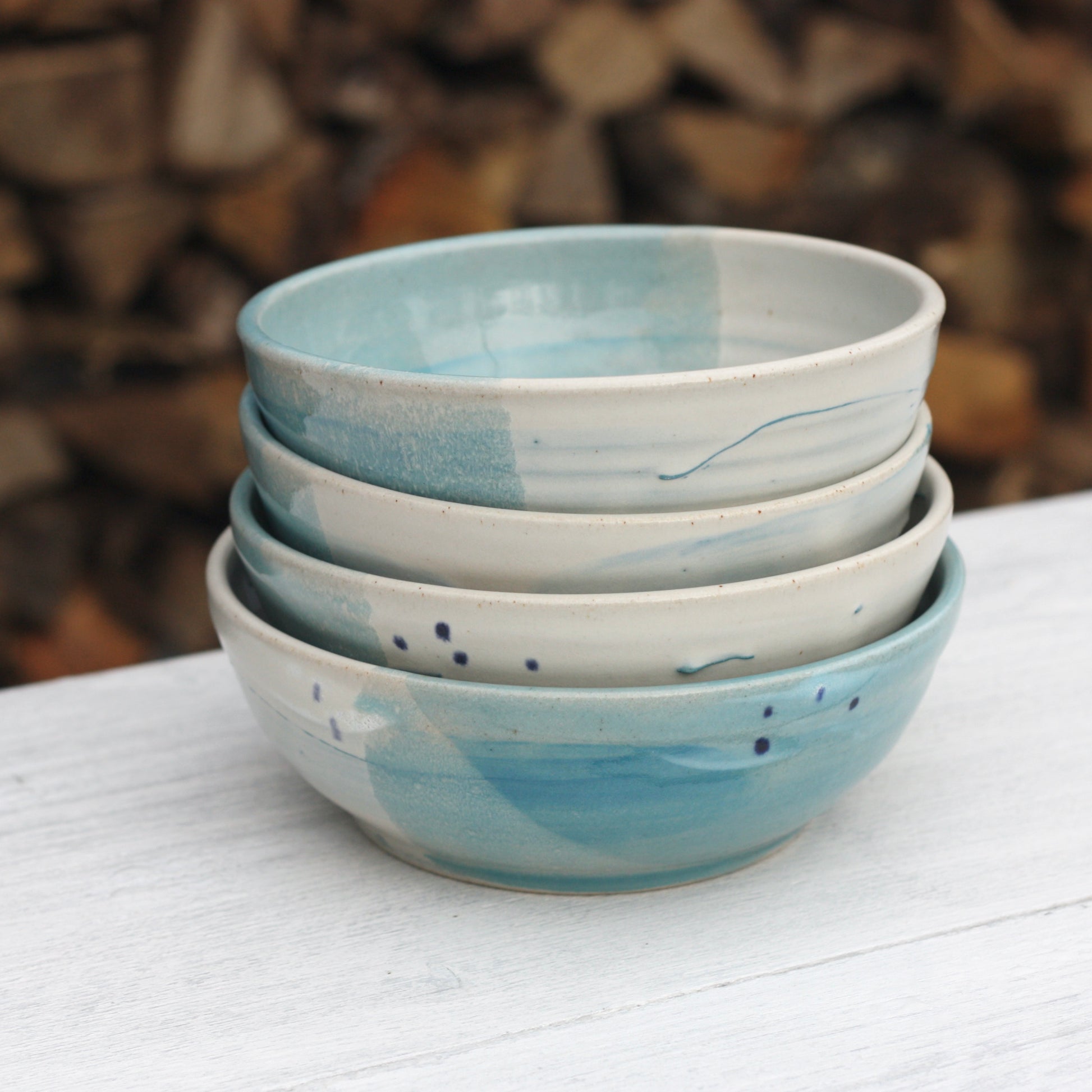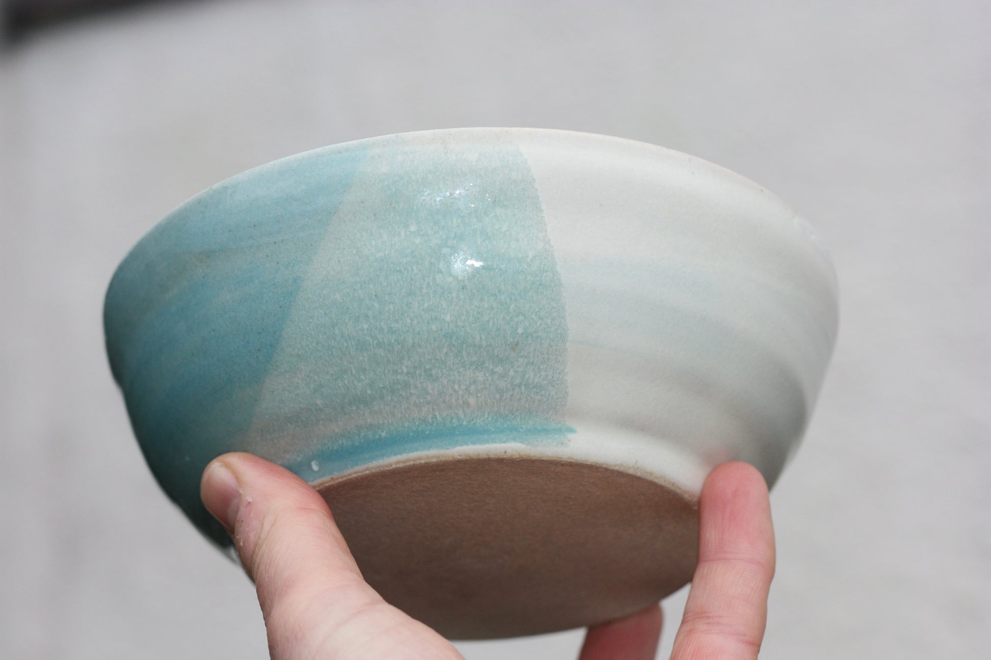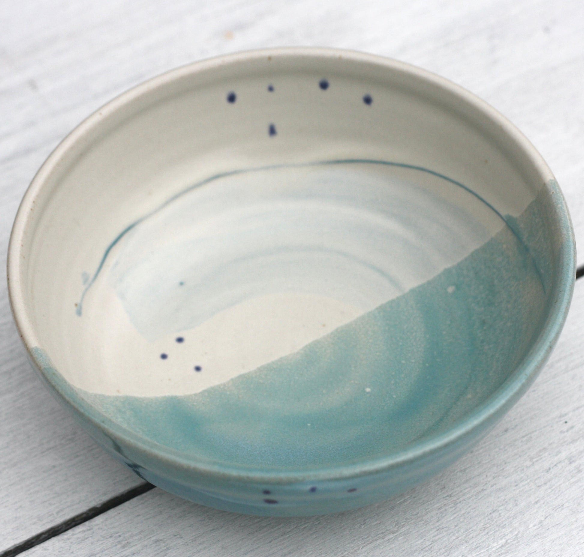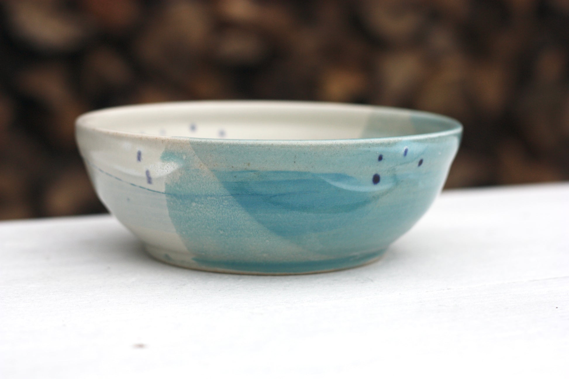 This is a listing for a cute decorated bowl in white, blue and soft blue glazes.
