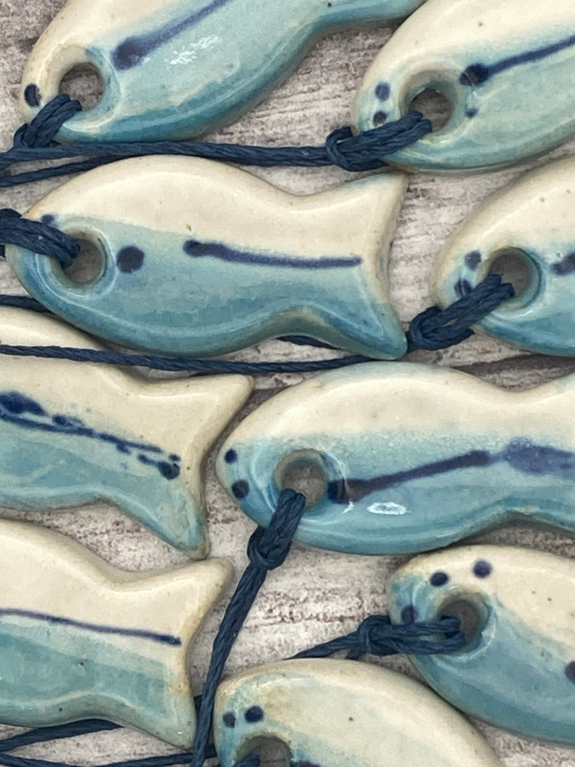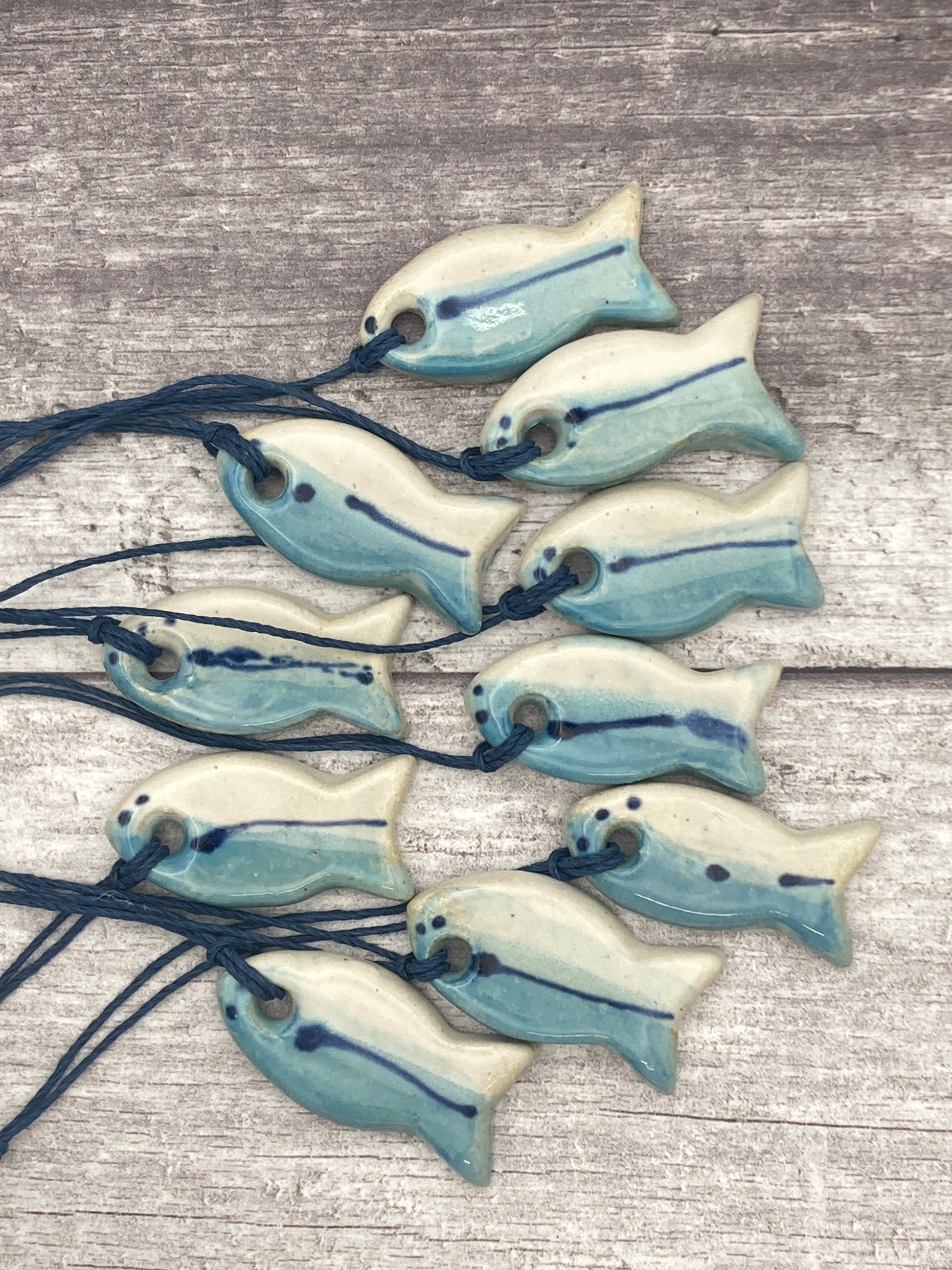 These decorations are made from stoneware clay, left to dry for a few days, bisque fired to 1005 degrees centigrade over 24 hours, glazed with handmade glaze and refired up to 1240 degrees centigrade for another 24 hours.