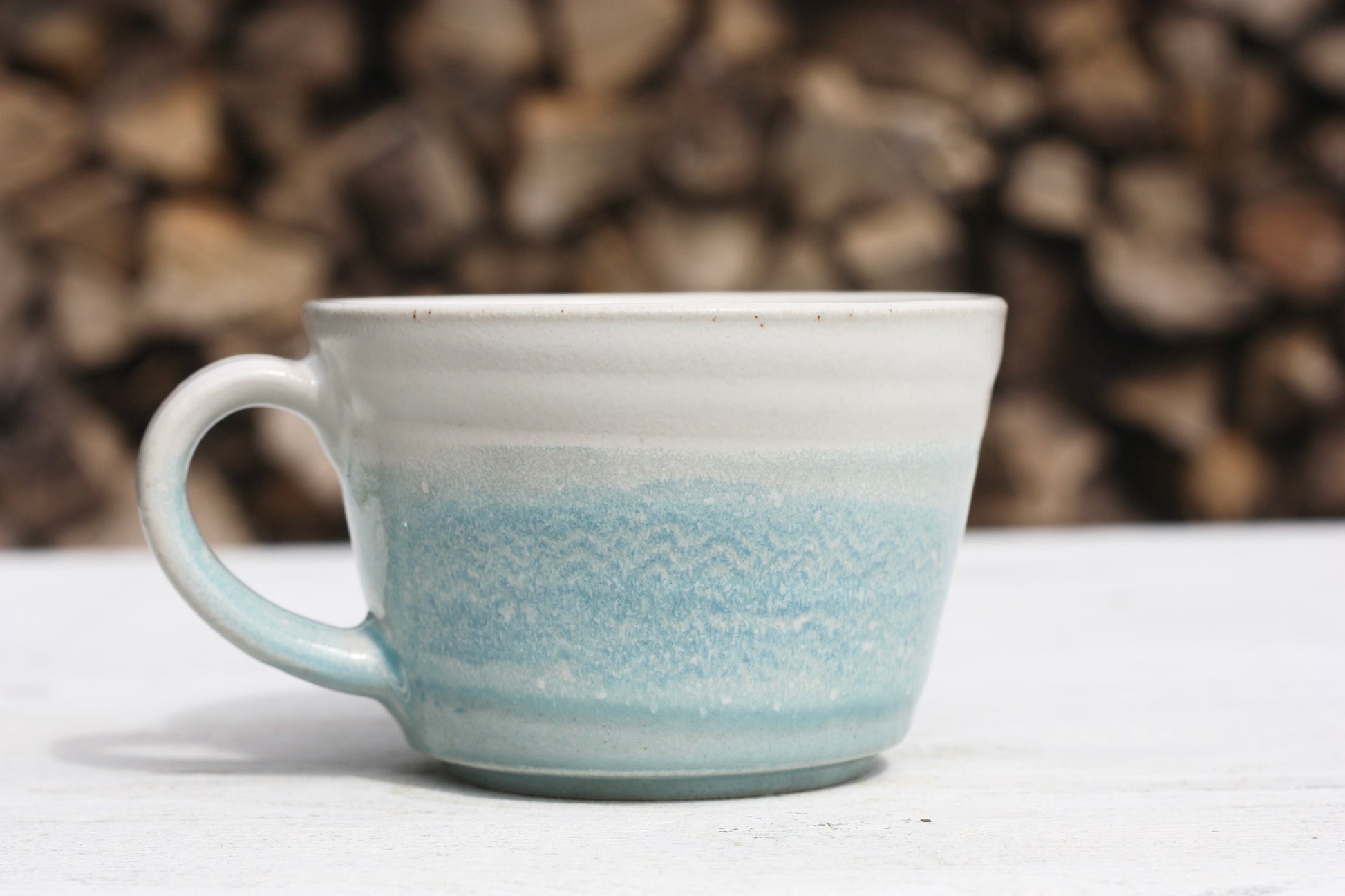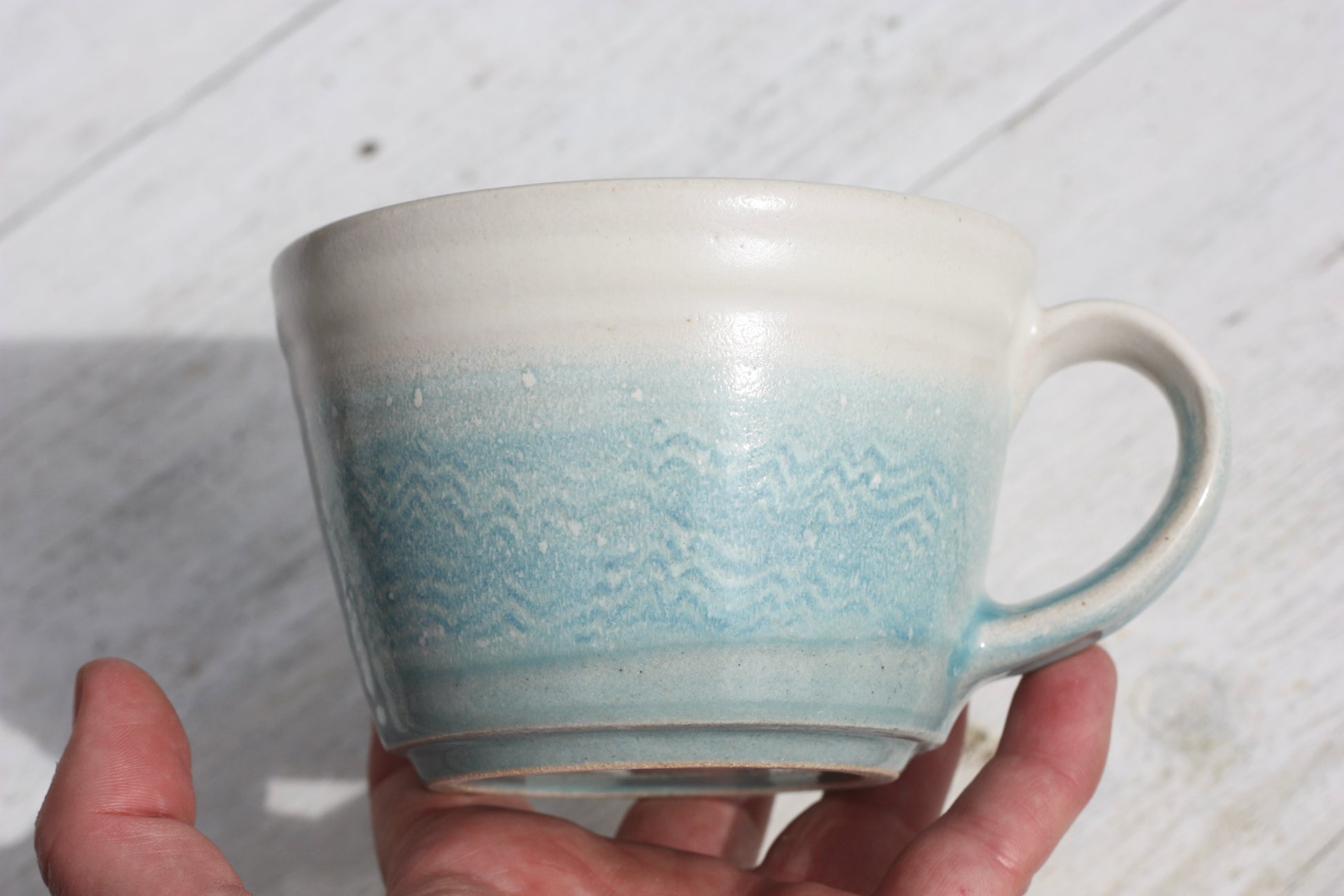 The glaze at the top's matt and white and the glaze below is shiny and blue and where they meet looks like the surf on the beach and there's a wave effect underneath the glaze :-)