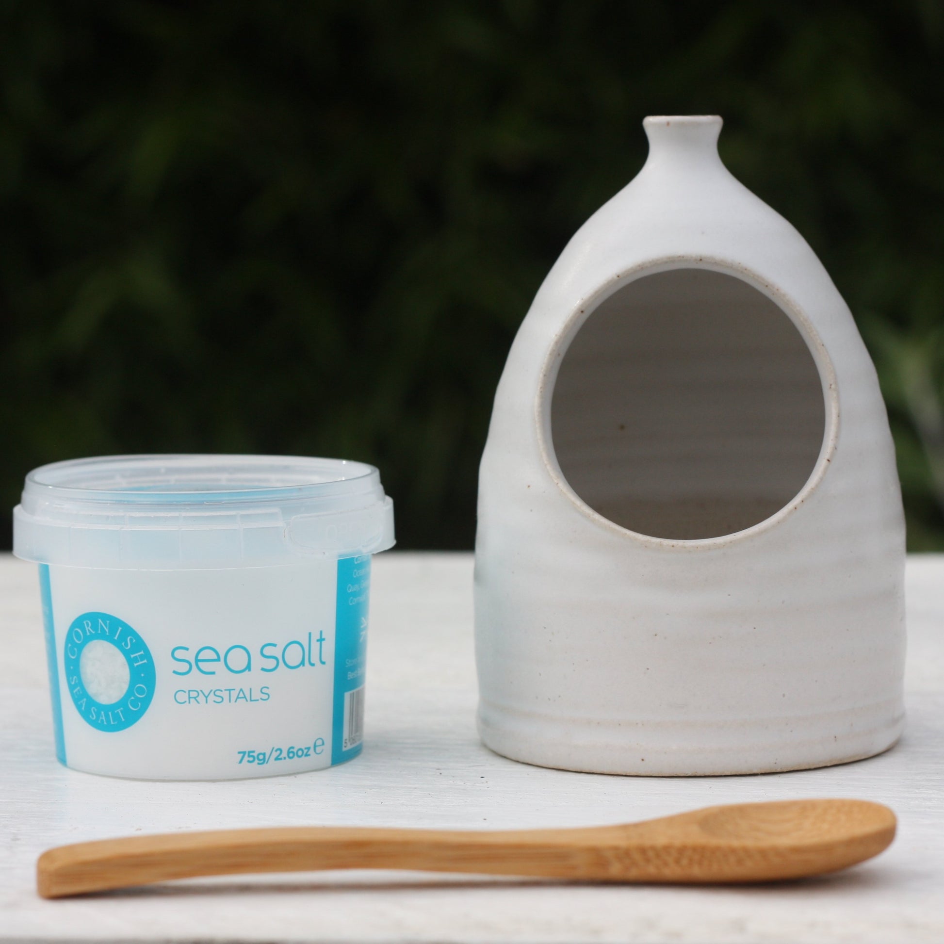 Small Salt Pig Gift Set in White with Cornish Sea Salt Pot and Bamboo Spoon