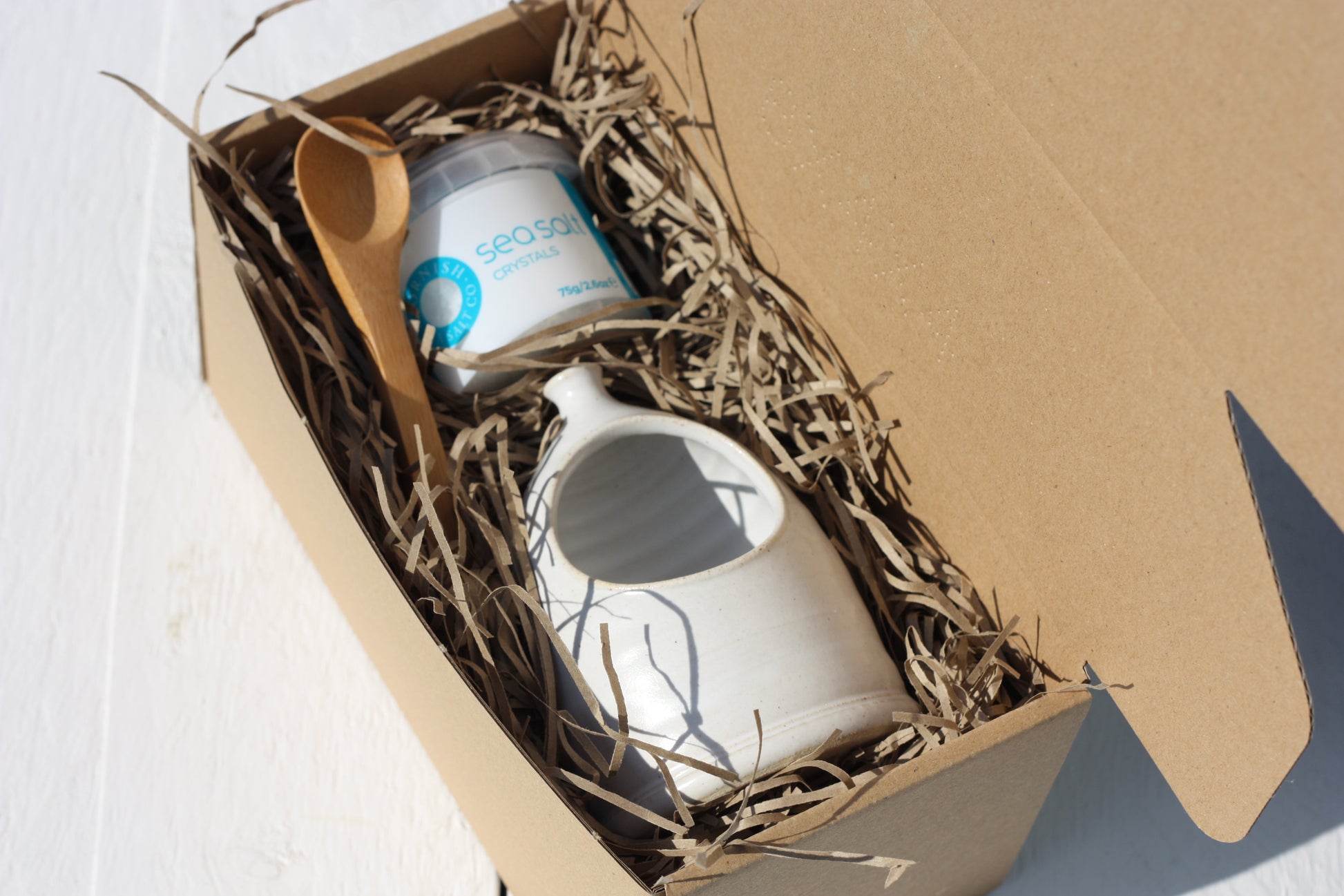 Here is a lovely White Salt Pig hand thrown by me with a cute little bamboo spoon and a 75g pot of Cornish Sea Salt which is made in the next village over from me.