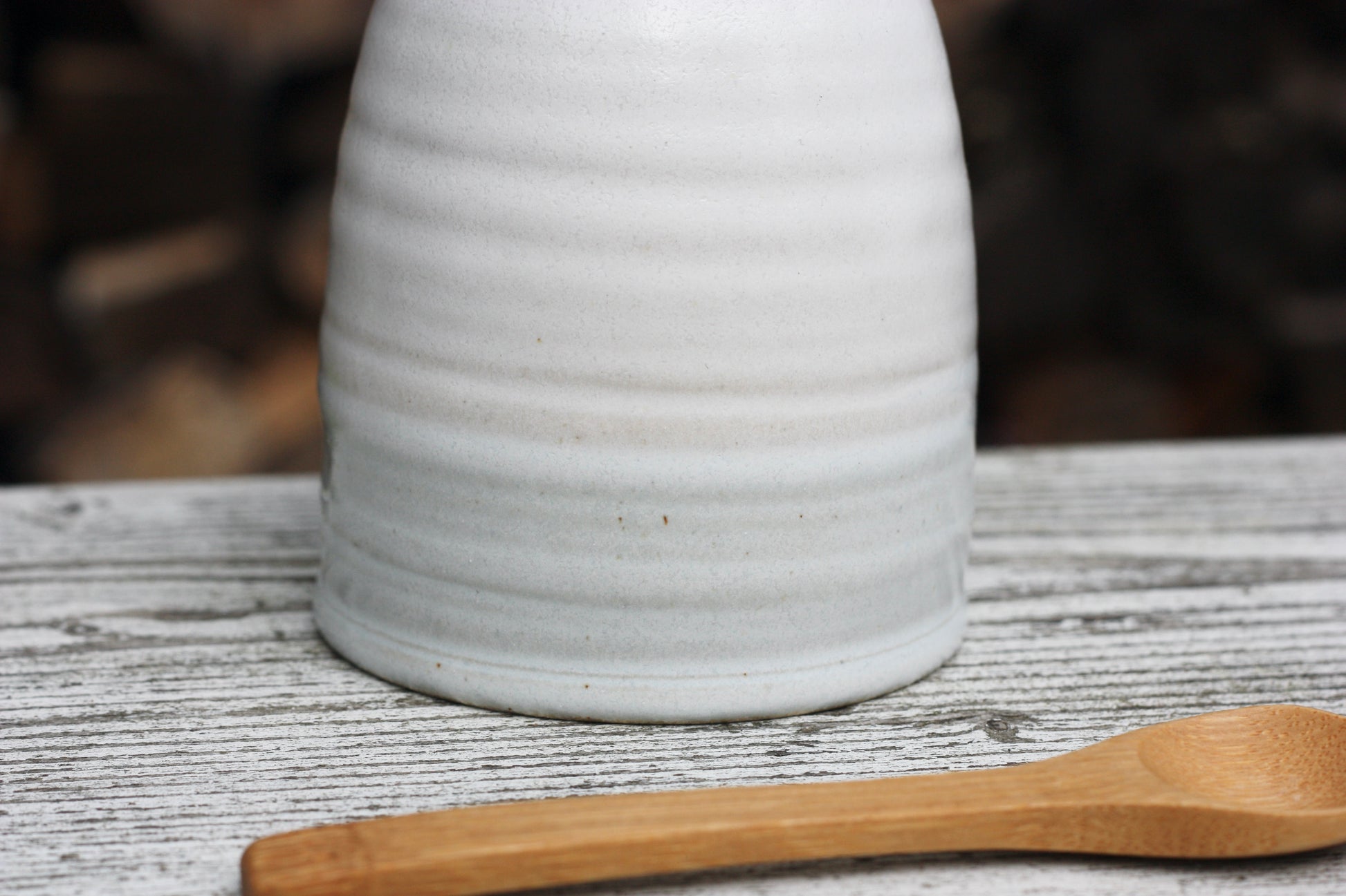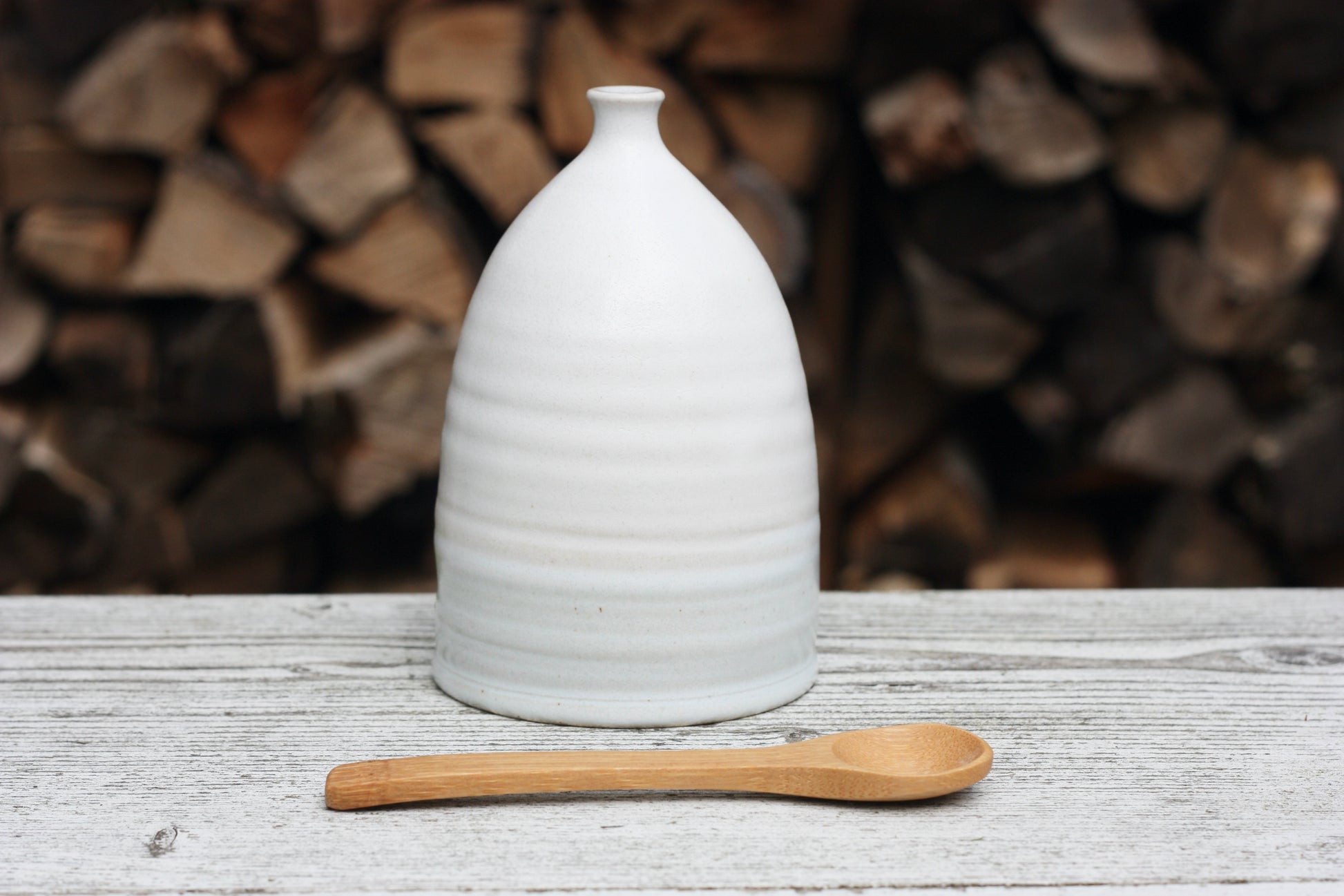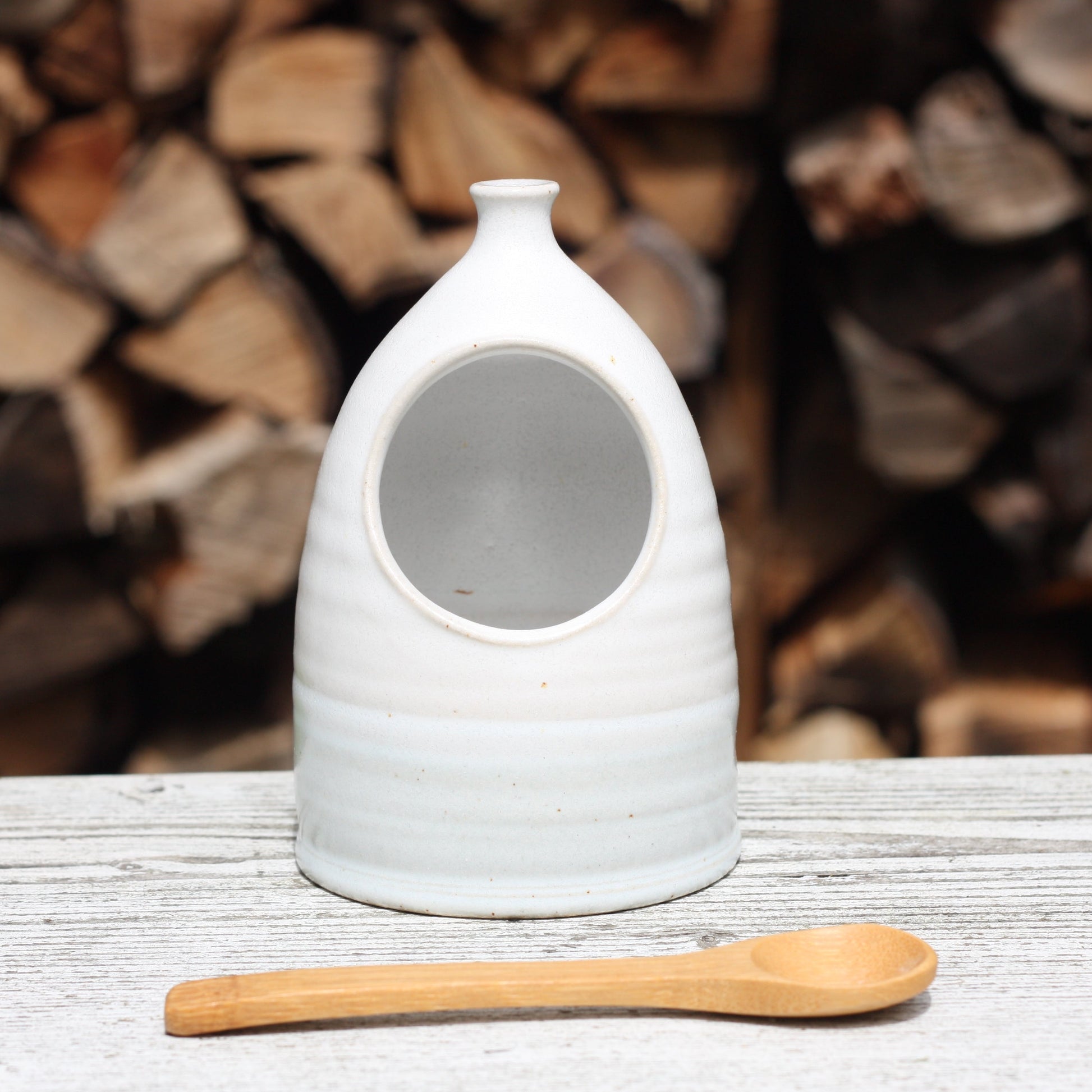 Hand thrown by me with a cute little bamboo spoon and a 75g pot of Cornish Sea Salt which is made in the next village over from me.