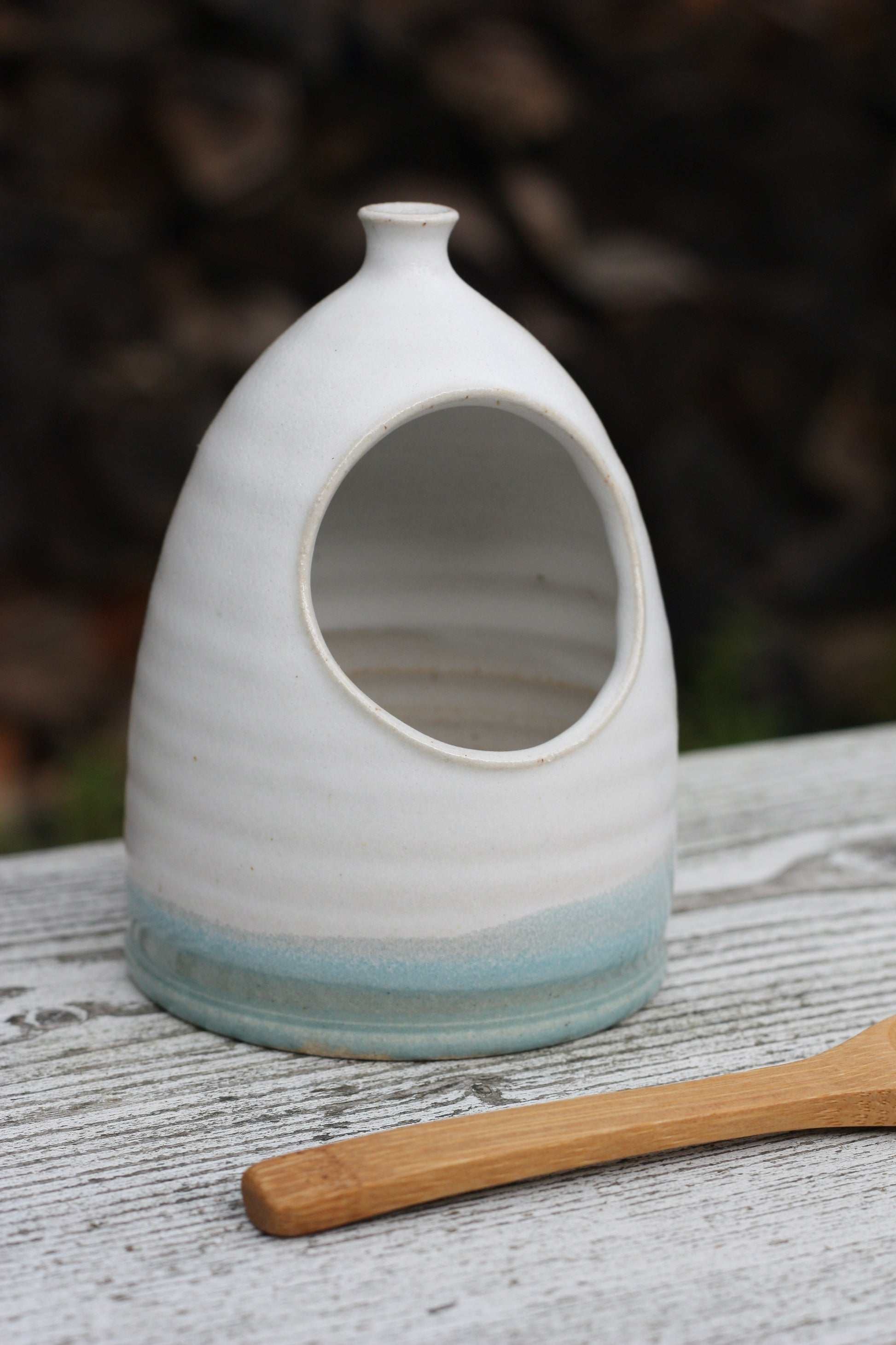 Hand thrown by me with a cute little bamboo spoon and a 75g pot of Cornish Sea Salt which is made in the next village over from me.