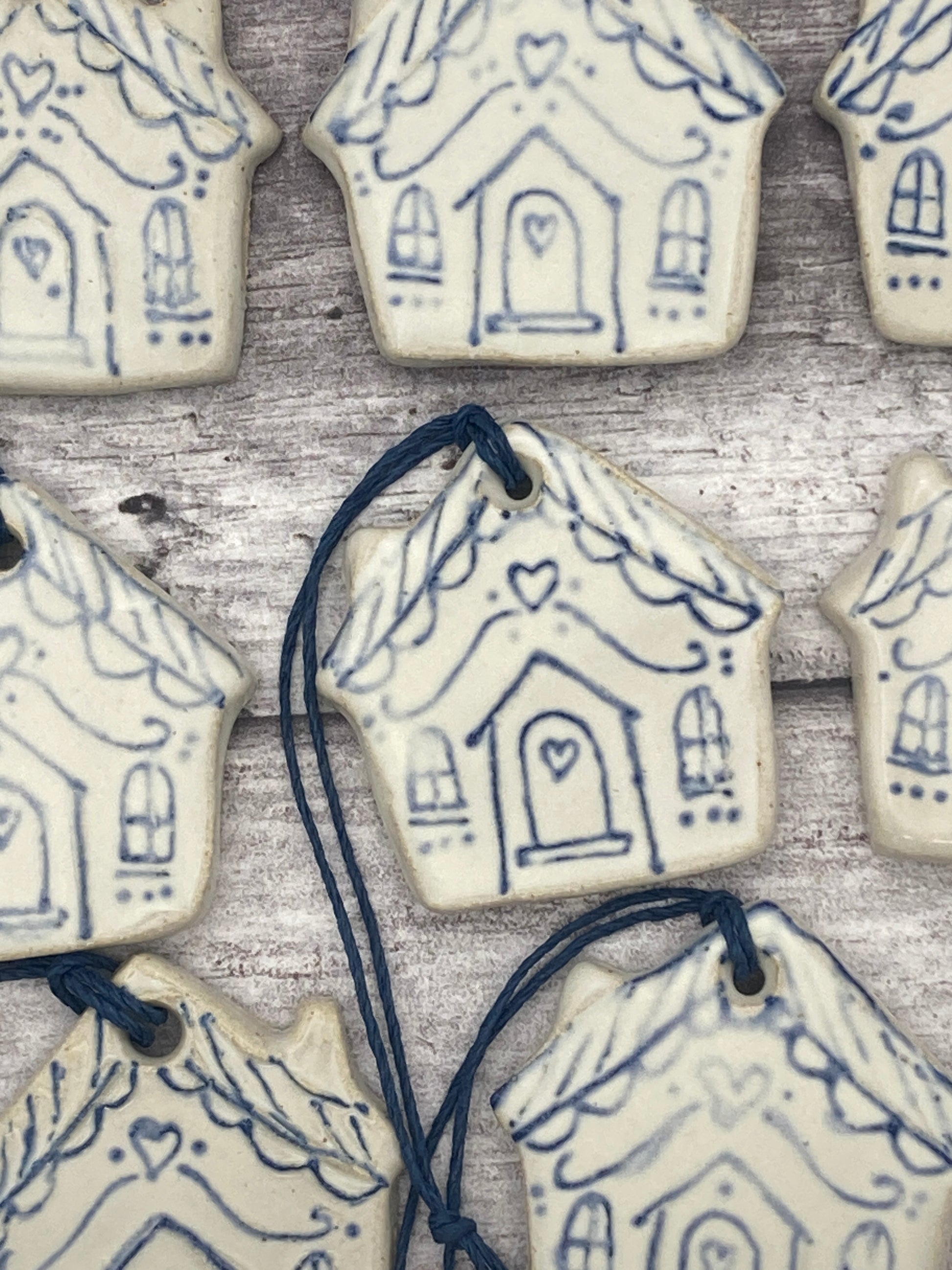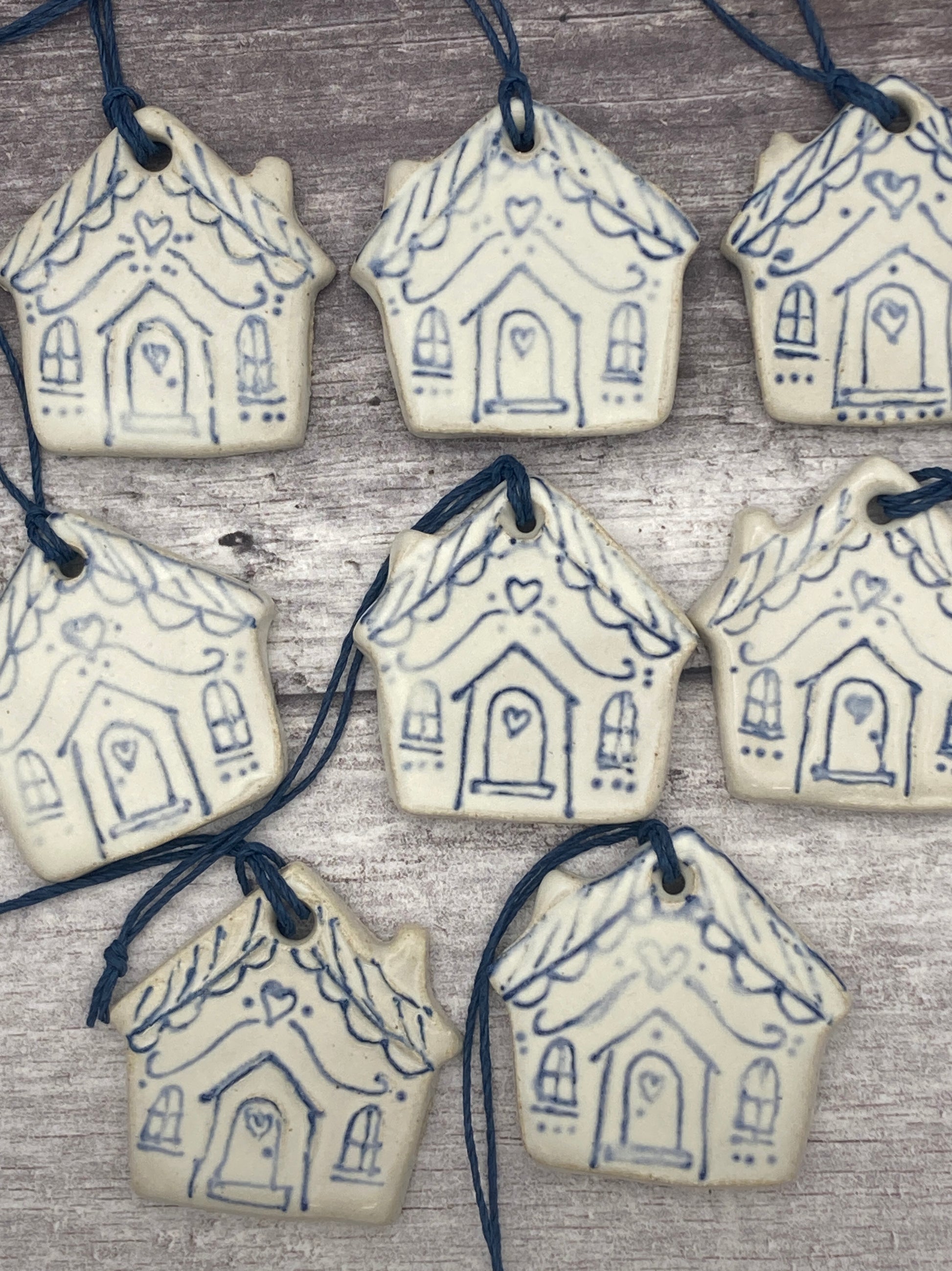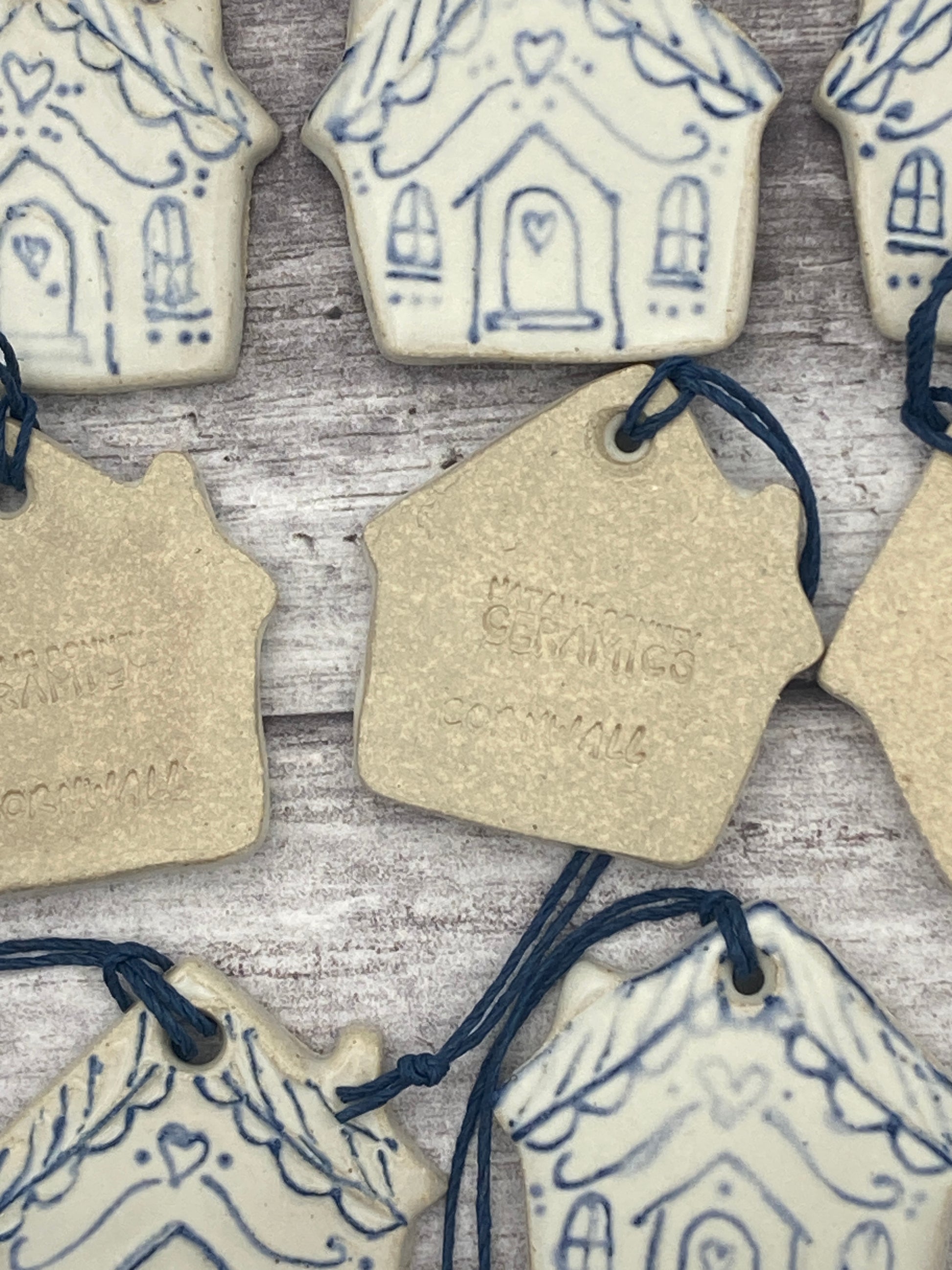 These decorations are made from stoneware clay, left to dry for a few days, bisque fired to 1005 degrees centigrade over 24 hours, glazed with handmade glaze and refired up to 1240 degrees centigrade for another 24 hours.